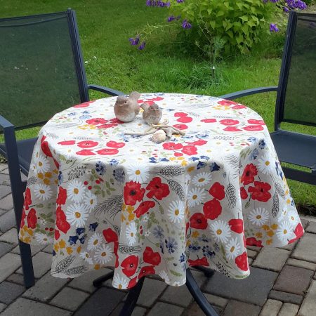 Round Tablecloth Linen Tablecloth Burlap Tablecloth Prewashed Gray Daisies Poppies Flowers 55" diameter